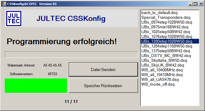 Einkabelumsetzer mit a²CSS(2)-Technologie, DiSEqC-Multischalter und Glasfaserwandler jeweils mit dem J-CONFIG-Logo können optimal auf die Anforderungen des jeweiligen Verteilnetzes angepasst werden. Das Einspielen der jeweiligen Konfigurationsdatei erfolgt mittels der PC-Software "CSSkonfig". Nebenstehend befindet sich ein Link zu einem ZIP-Archiv mit dem für einen Windows-PC geeigneten Konfigurations-Programm "CSSKonfig", sowie einer Anleitung und einigen für häufige Konfigurationen geeigneten Konfigurationsdateien.
